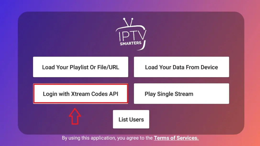 Nu kan u uw app instellen, installeer deze eerst uit de play store, en open hem daarna, dan krijgt u dit, kies hier voor Login with Xtream Codes API.